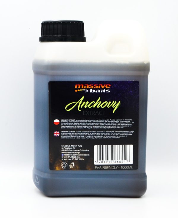 ANCHOVY EXTRACT to prawdziwy ekstrakt produkowany ze świeżych sardeli. Powstaje w procesie 18 miesięcznej fermentacji, w celu wydobycia najlepszego smaku, naturalnych protein oraz mocnego zapachu. Dzięki tak długiej fermentacji ekstrakt uzyskuje naturalny ciemnobrązowy kolor i wspaniały smak. Zawiera 77% extraktu z anchovy, 20% soli oraz 3% cukru. Działa jako naturalny wzmacniacz smaku i zapachu i wydobywa smak kulek, zwłaszcza rybnych. Nadaje się absolutnie do każdego rodzaju przynęt – do produkcji kulek, do zanęt, method i stick mixów, jako dip lub booster. Nie rozpuszcza materiałów PVA.