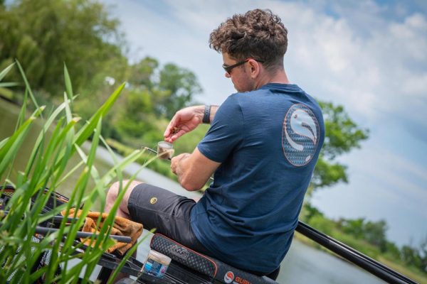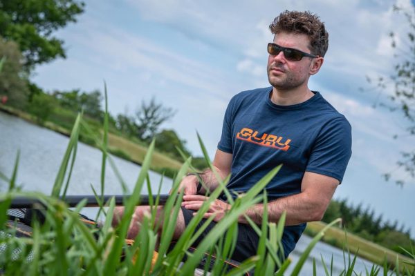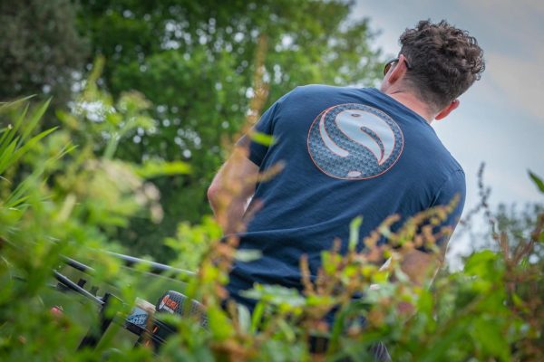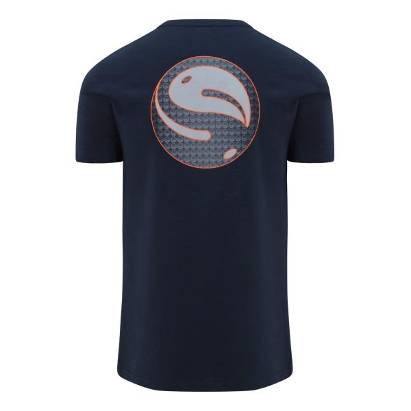 Lekki, granatowy t-shirt z krótkim rękawem, z przecięciem graficznym Guru z przodu i dużą granatową grafiką Guru z tyłu.
