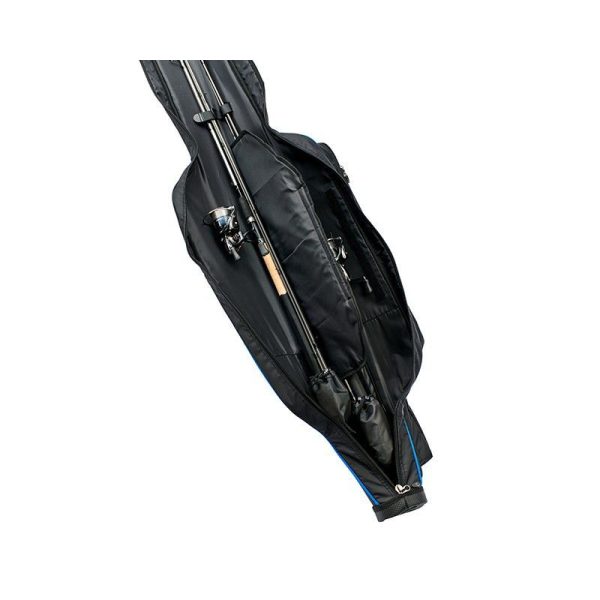 Wzmacniany pokrowiec z twardym dnem na 2 wędki z kołowrotkami. Wędki mogą być wewnątrz tak ułożone, aby kołowrotki nie dotykały się i nie uszkadzały nawzajem. Wewnętrzna przegroda chroni przed porysowaniem się wędki o wędkę. Trzy zewnętrzne kieszenie na parasol, wymienne szczytówki i podpórki. Wyposażona w obszyty pas na ramię i neoprenowe uchwyty.